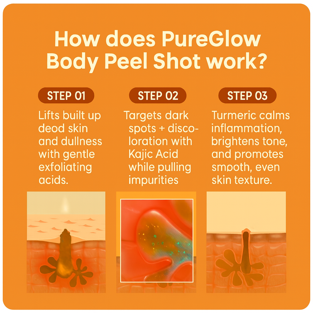 PureGlow’s Kojic + Turmeric Body Peel Shot works on the areas you usually hide — underarms, inner thighs, knees, elbows, and anywhere dullness or hyperpigmentation shows up.